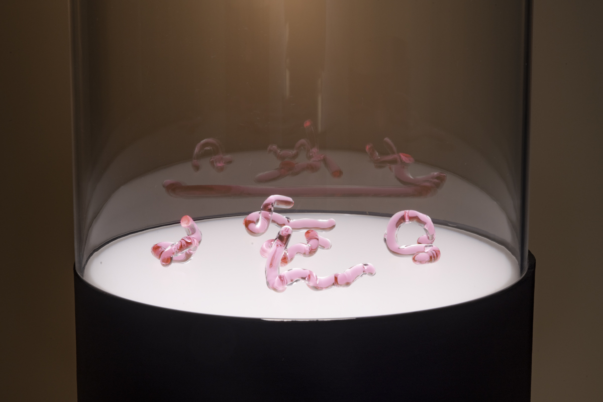 The Lovesick installation consists of ten vials of the glowing virus contained in small glass sculptures modeled from different energy states of the oxytocin molecule. This is accompanied by video and photographs of microscopic human cells expressing the infection, and a polyphonic ballad intoning the letters representing the proteins from which oxytocin is comprised. A meditative space is created in which the viewer can contemplate consuming a virus that will change their DNA forever.