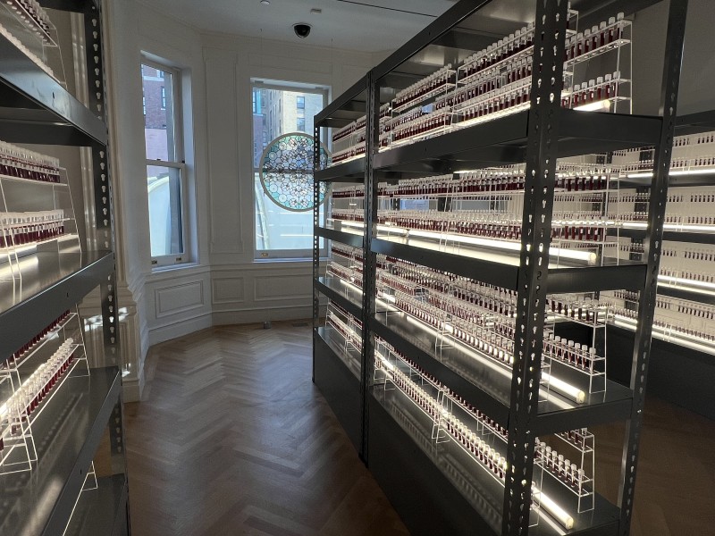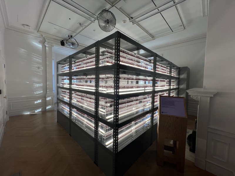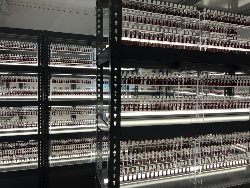 As the viewer winds through a spiral of shelves of small tubes of blood in the chilled room they hear sound recorded in actual biobanks, for example the national biobank of Denmark which I documented, which houses blood from every baby born in the country since 1982.